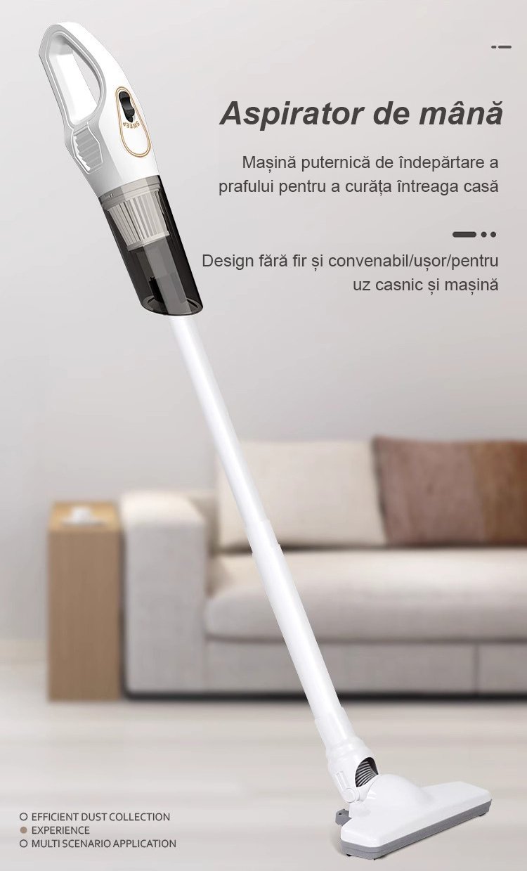 Aspirator de mână fără fir cu funcție de aspirare și ștergere.